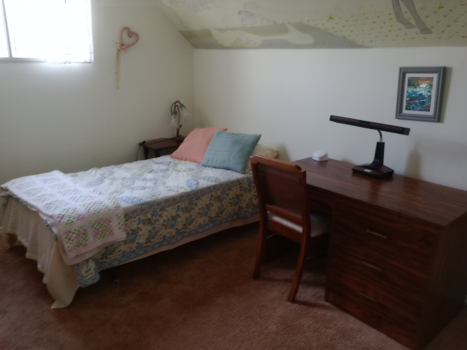 Furnished upstairs bedroom for rent.  Shared bathroom with upto two others. Bathroom on main floor.  Kitchen and laundry available.  Cat on premises.
