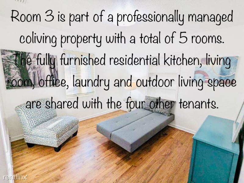 Private room, flexible lease terms, all utilities and wi-fi included. Professionally managed quiet 5 bedroom coliving home for professional adults. Shared amenities include a fully equipped shared kitchen, shared furnished living and dining areas, shared office area, shared indoor laundry, and shared outdoor living space. Home has central heat and air. Ideal for travel nurses, gig workers, and new arrivals to the area.